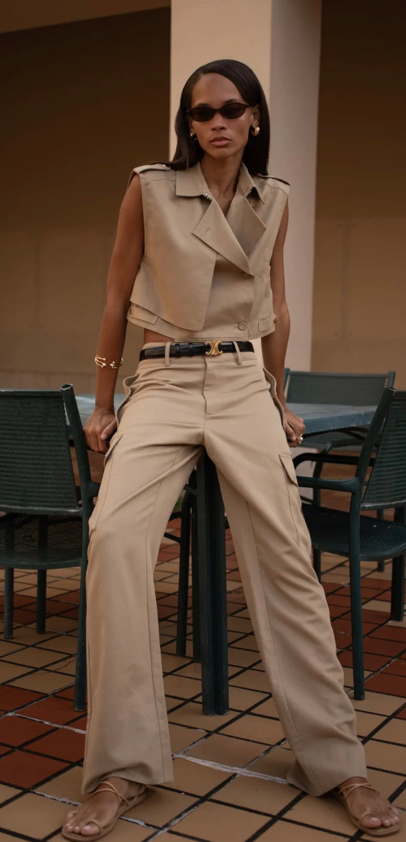 A modern take on the classic trench with the matching cargo pant. Super sharp set in a khaki neutral tone.